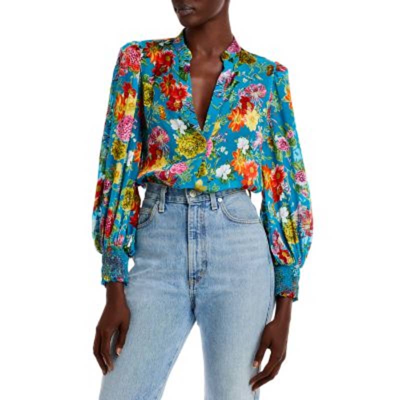 ALICE + OLIVIA Ladies Blue Basic Floral Print Smocked "Sheila" Blouse