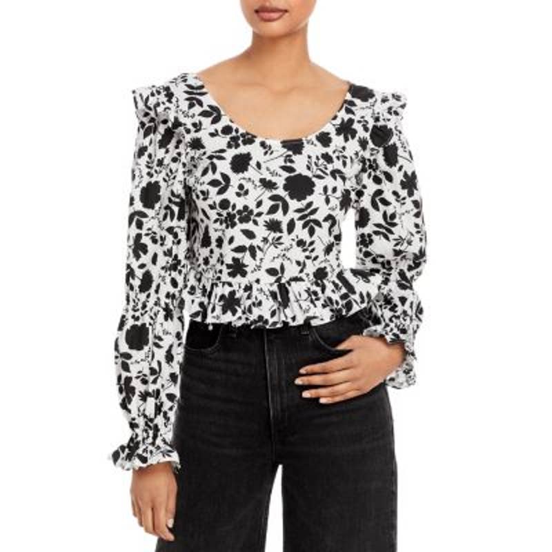 AQUA Ladies Black & White Floral Print Long Sleeve Crop Top, Lace Up Back