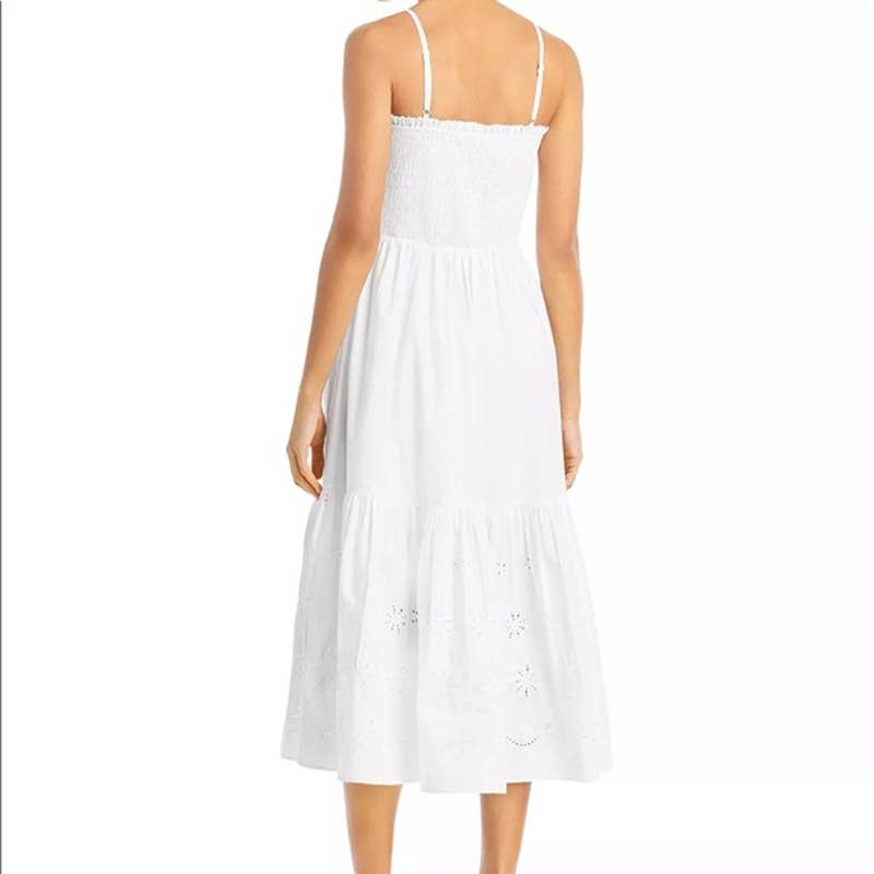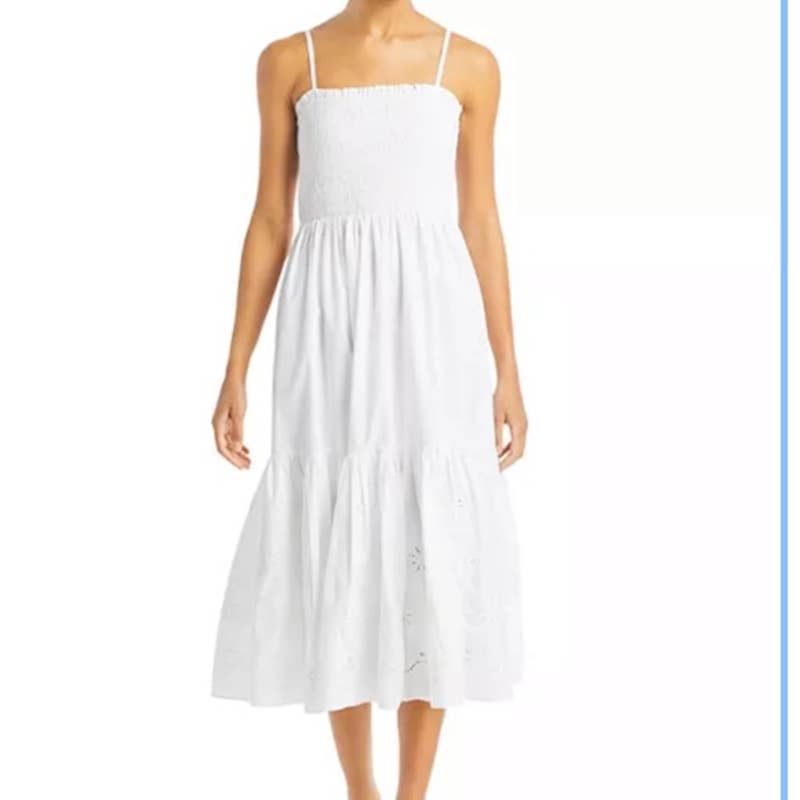 AQUA Ladies White Smocked Eyelet Midi Dress, Adjustable Spaghetti Straps