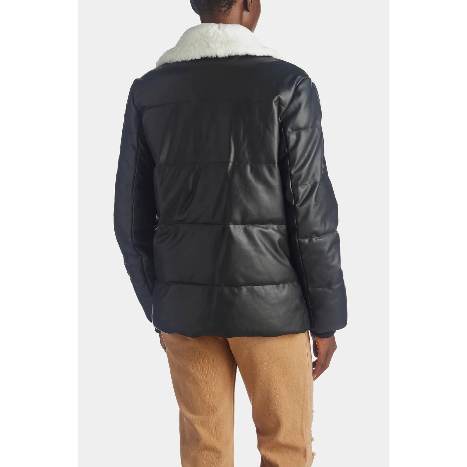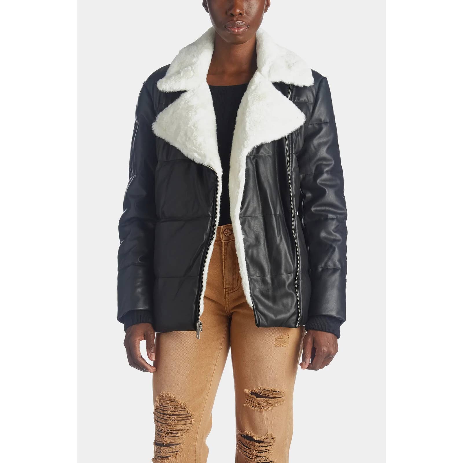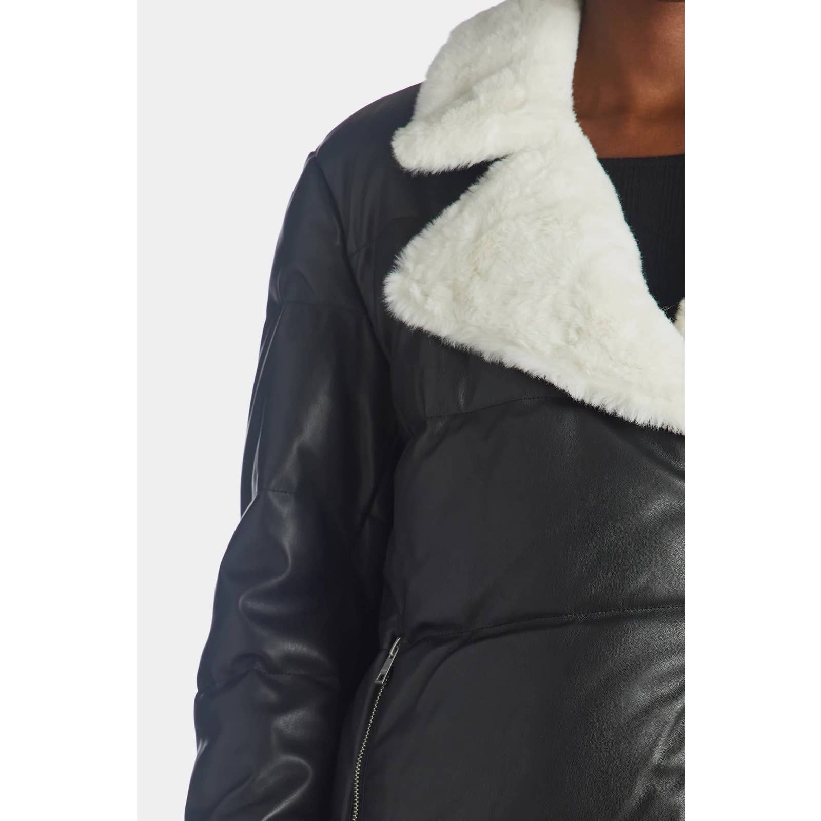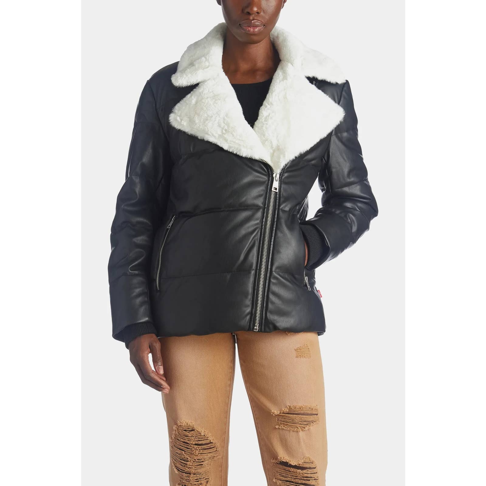 Asymmetrical Vegan Leather Moto Puffer Jacket Faux Fur Trim