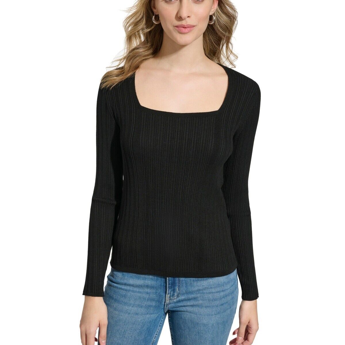 Calvin Klein Ladies Black Ribbed Square Neck Long Sleeve Top