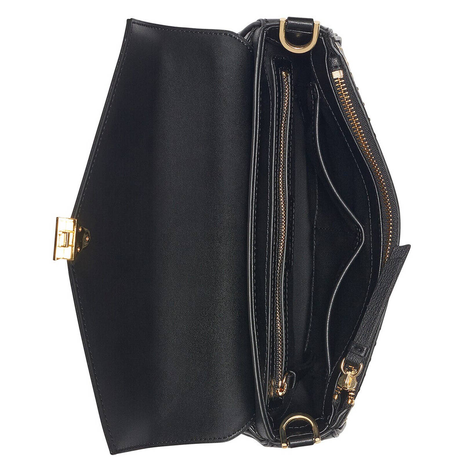 * Edgy and inspired, this crossbody bag is made with smooth leather and features a push lock closure. - Single crossbody chain strap - Foldover flap with logo push lock closure - Exterior features quilted leather construction - Interior features 1 zip pocket and 1 slip pocket - Approx. 6.25” H x 10” W x 3” D - Approx. 22” strap drop - ImportedMaterialsLeather exterior, fabric lining