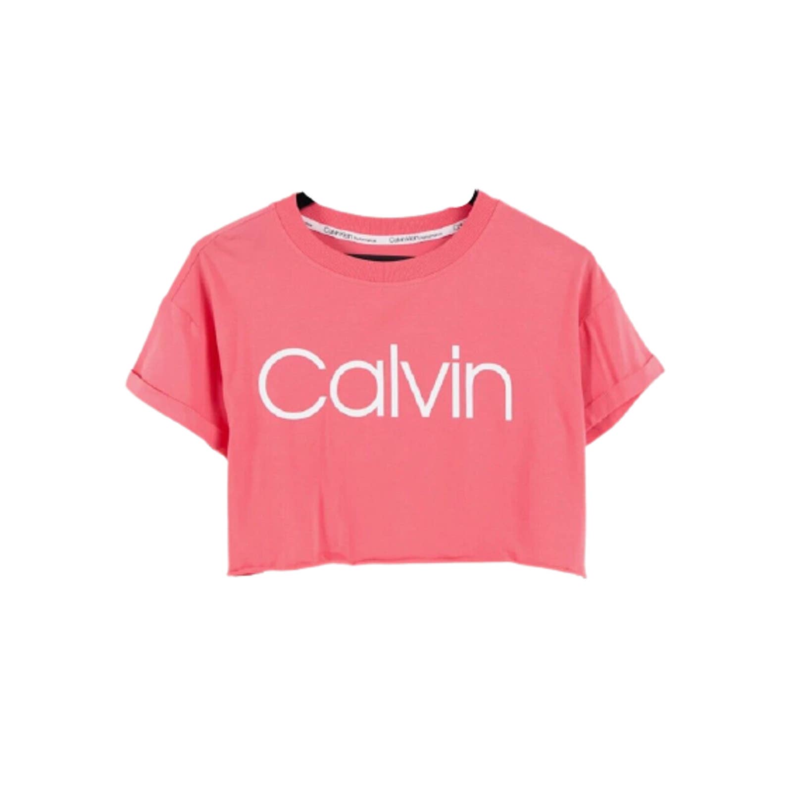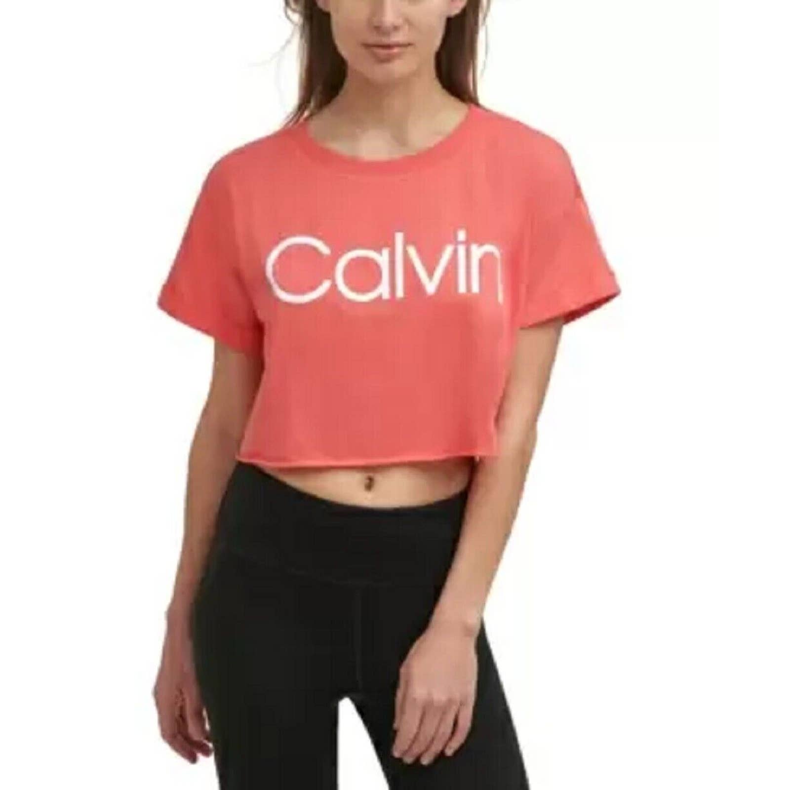 Calvin Klein Womens Cropped Raw Hem Logo T-Shirt Radiance Coral