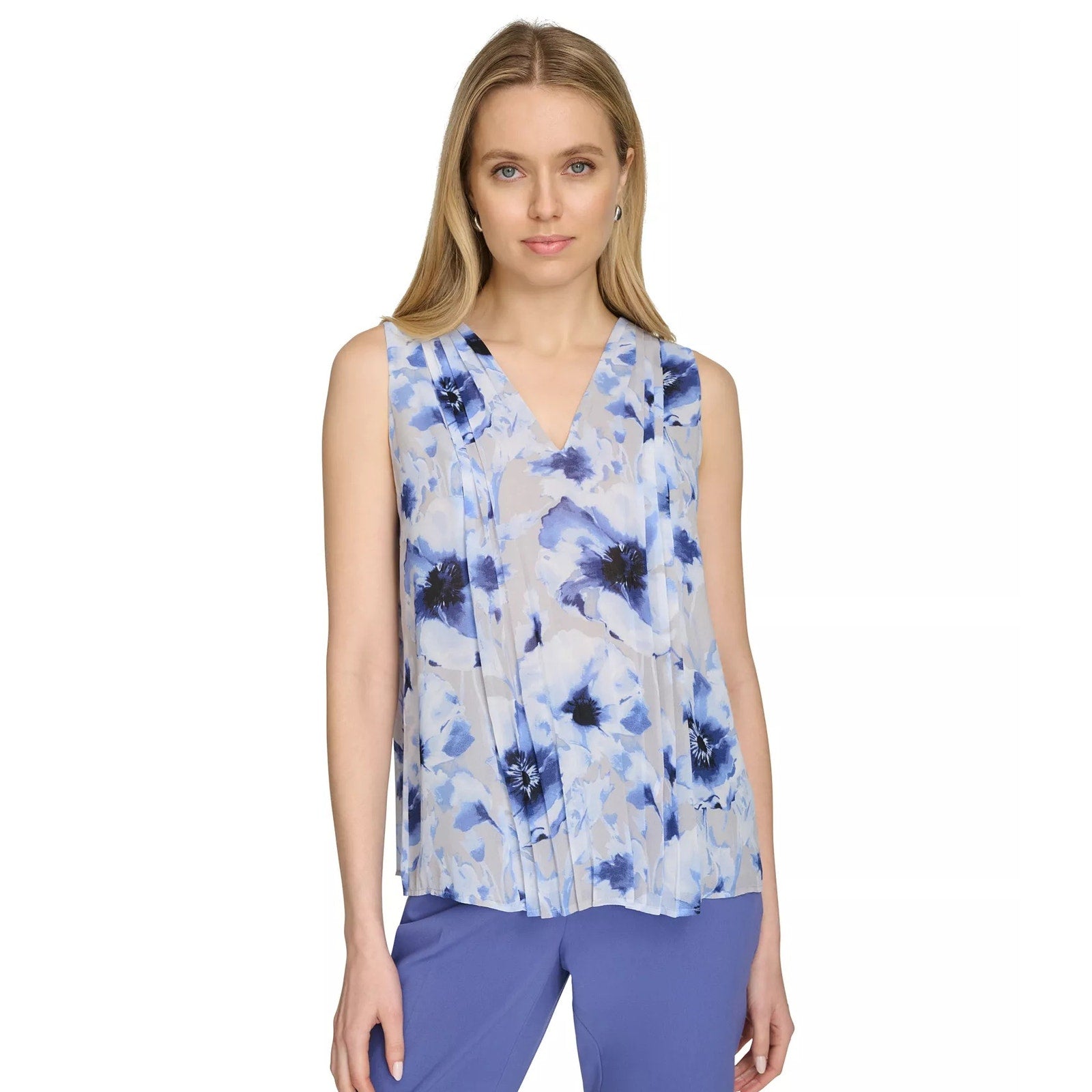 Calvin Klein Women's Printed Sleeveless Pleated Top in Spring Blue Multi