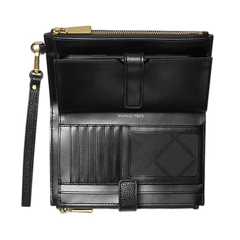 Crafted from pebbled leather accented with a leopard print calf hair center stripe, this studded wallet has two zip sides that unfold to reveal a center with pockets for all the essentials—from credit cards to your smartphone. A detachable wristlet strap makes it versatile enough to carry alone or in a tote.