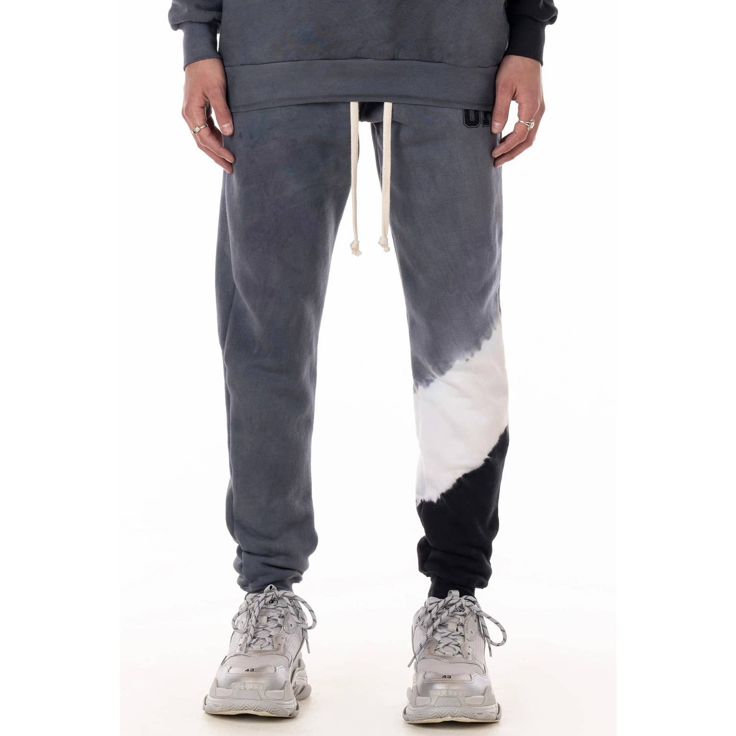 Gray sweatpants with black and white tie dye stripes on left leg.
