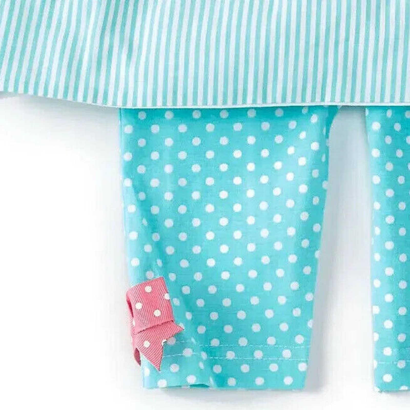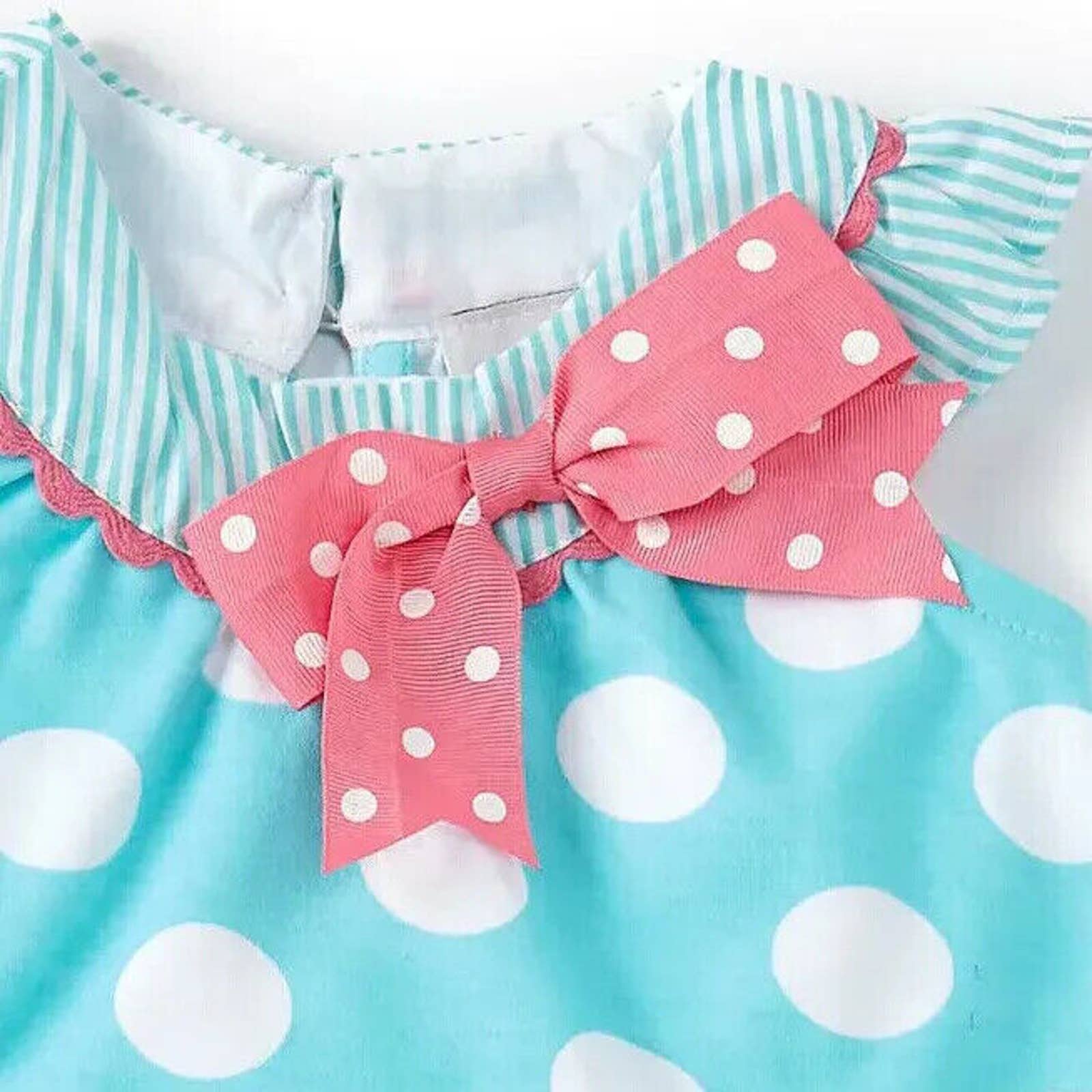 Teal blue tunic top with white polka dots and pink bow & trim accents.