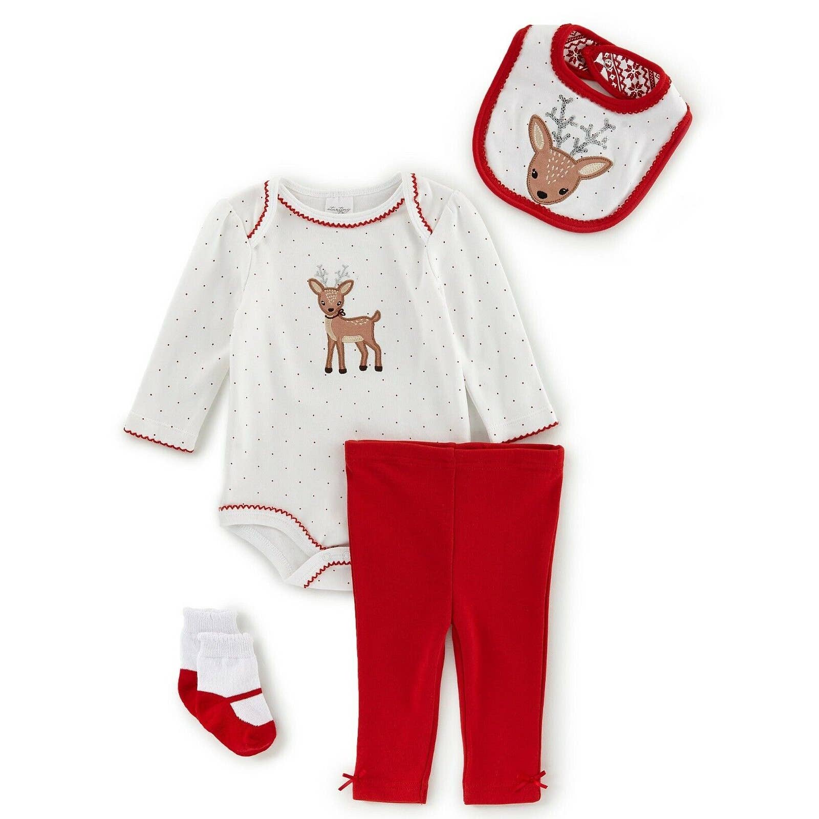 STARTING OUT Baby Girls Bodysuit Pant Bib Sock Set 4 Pc, Christmas Reindeer