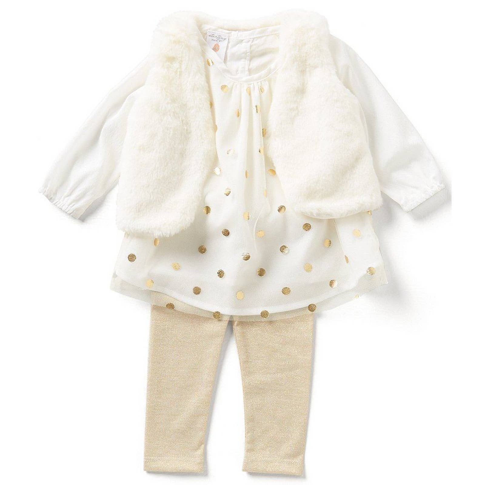 STARTING OUT Girls 3 PC Set Ivory Top, Gold Leggings and Faux Fur Vest