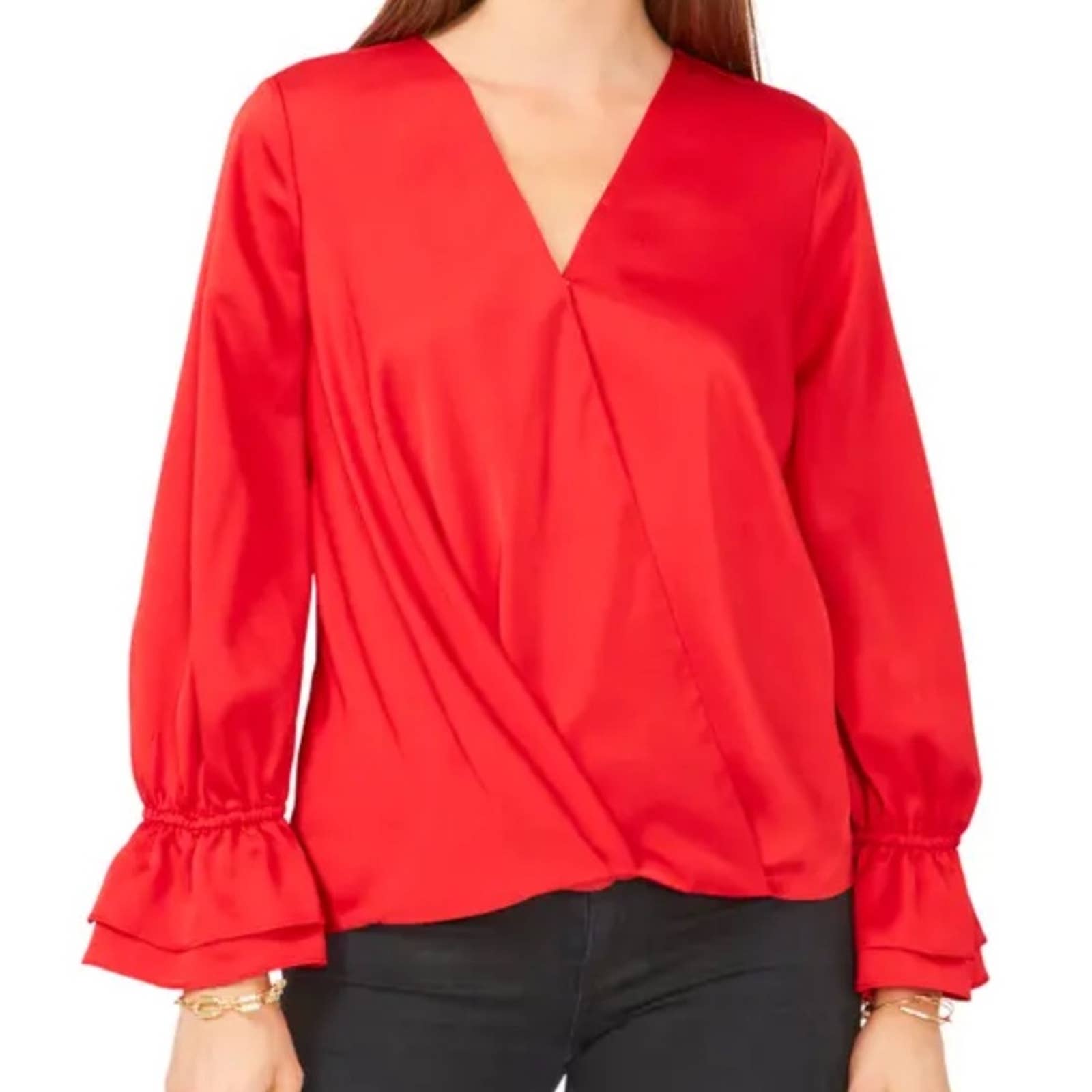 Vince Camuto Rich Red Wrap Blouse w/ Bell Sleeves, V-Neck